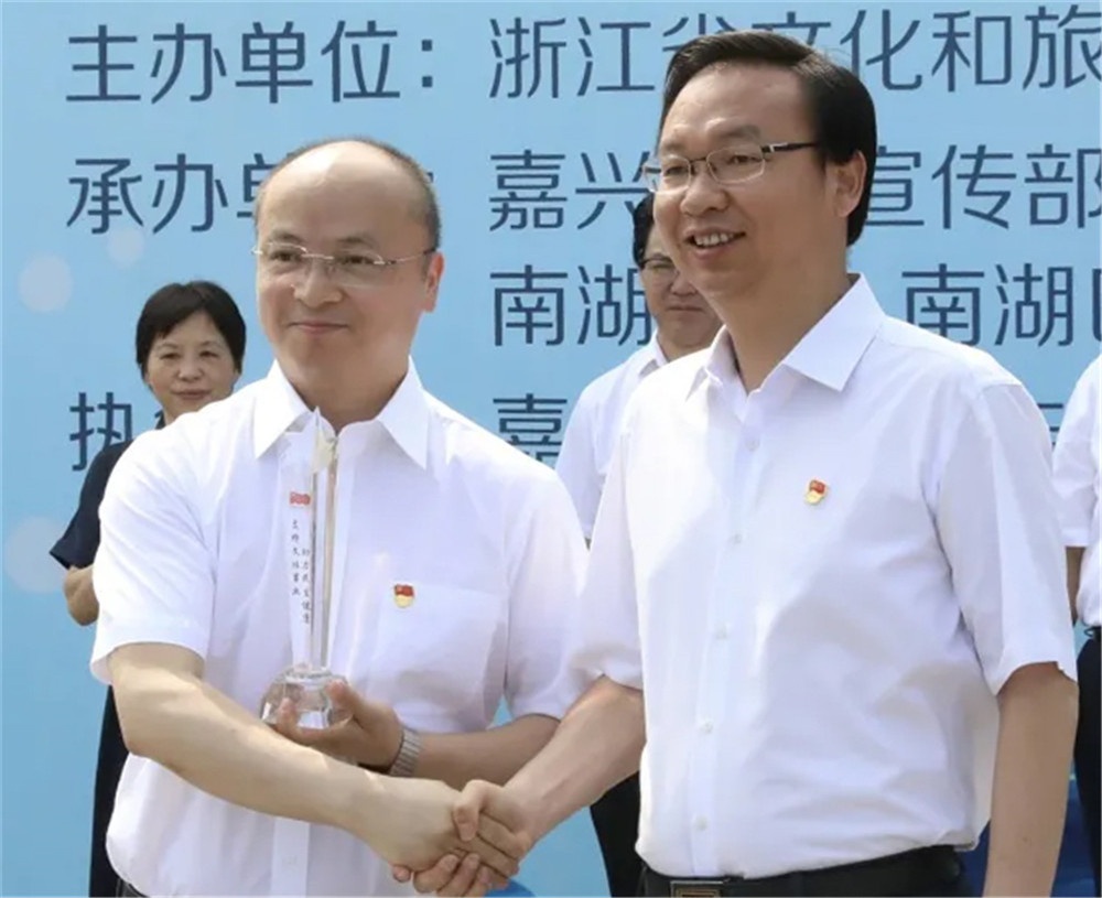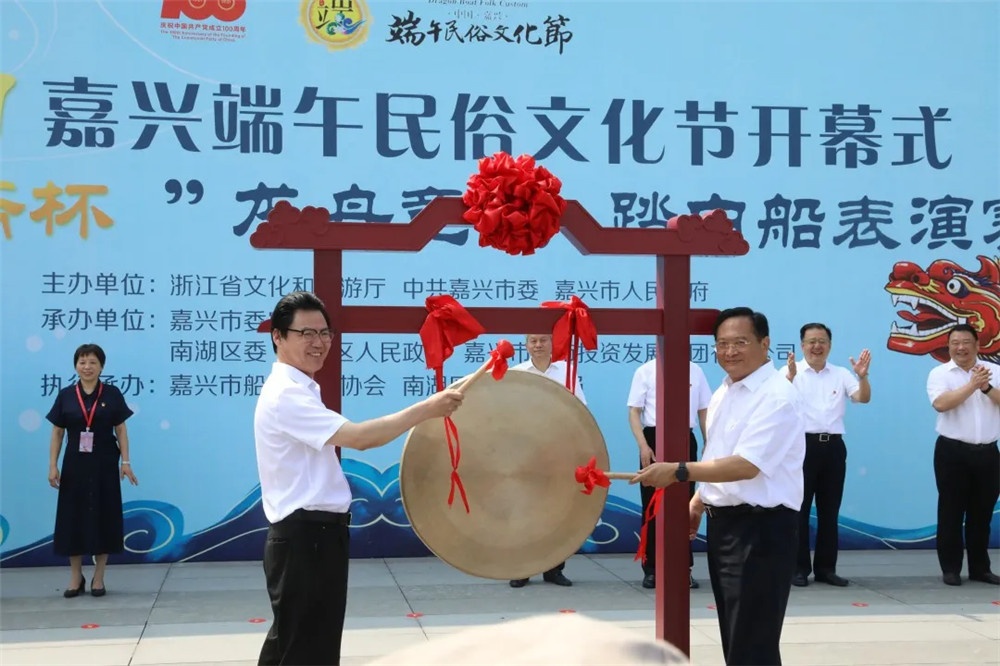 市委書(shū)記張兵(右)與省文化和旅游廳副廳長(zhǎng)葉菁(左)為2021嘉興端午民俗文化節(jié)鳴鑼開(kāi)幕